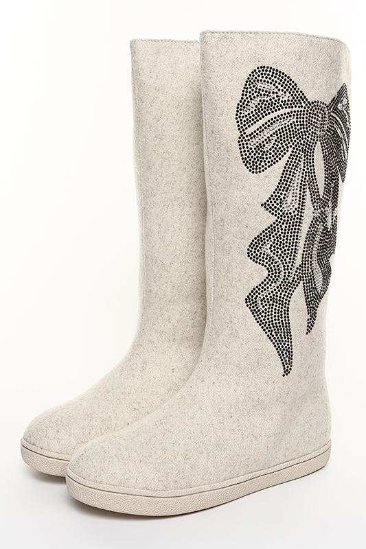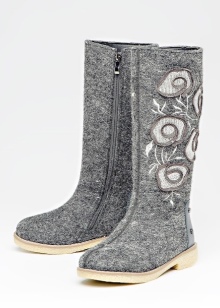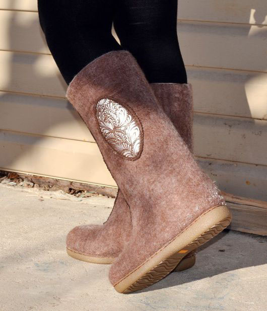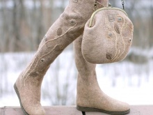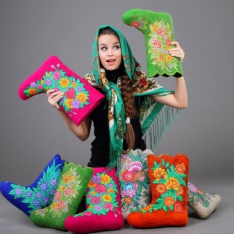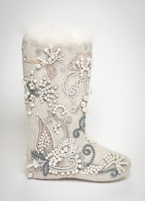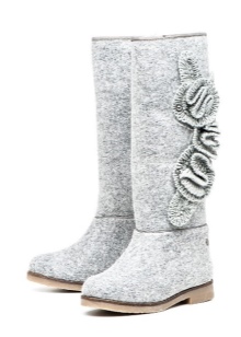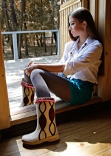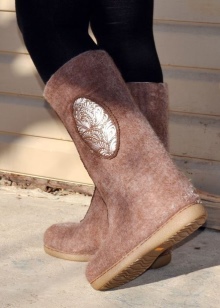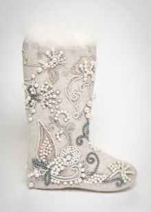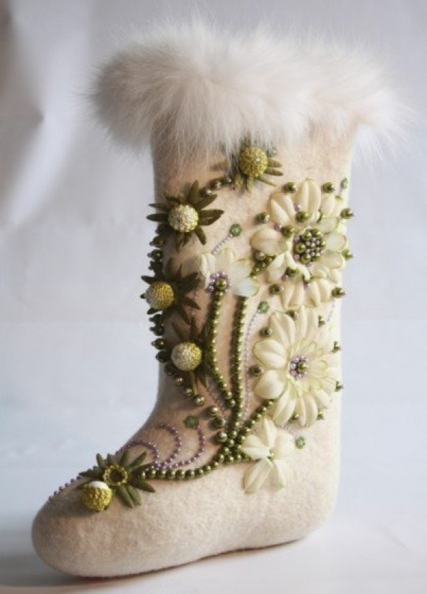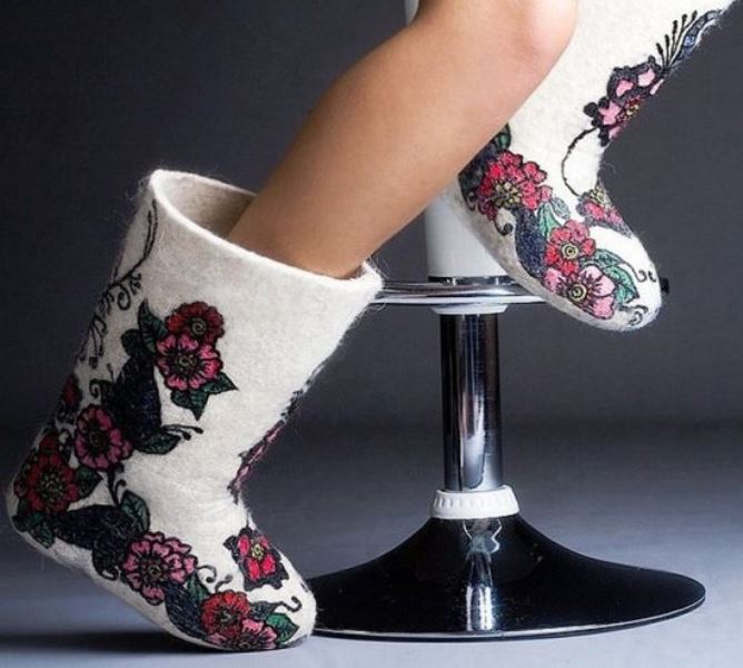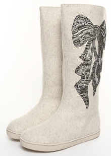 Very beautiful and fashionable solutions with the use of various decorations. These include beads, lace, embroidery, and various combinations of felt felt boots with fur inserts, leather, velvet and suede.