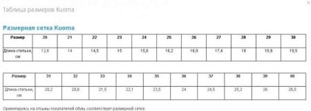 In accordance with the length of the foot, Kuoma boots for adults have a size range from 35 to 50 sizes. As for children's products, this is the range from 16.5 to 37.5. As you can see, this is in some way different from the usual Russian sizes. Therefore, when choosing shoes should be based on the length of the foot, comparing it with the length of the insole. Those who neglect this condition risk to make a mistake in choosing the right size, especially if the shoes are ordered through the online store.