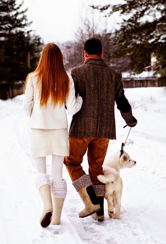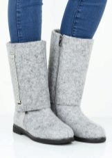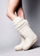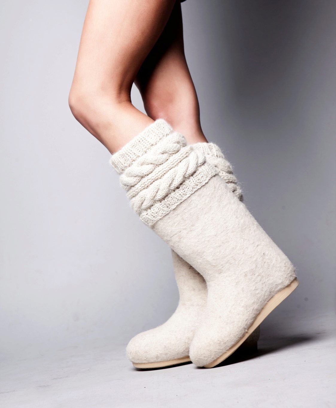 A great addition to felt boots is skinny jeans and a warm volley sweater. Also, these shoes look good with leggings and knitted tunic, pullover, turtleneck, stylish fur vest. Note that trousers are usually tucked into felt boots.