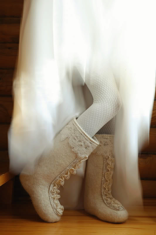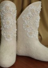 Wedding boots purchased specifically for honeymooners. They are decorated with typical embroidery, elegant lace, etc. Paired models for the bride and groom complement each other.