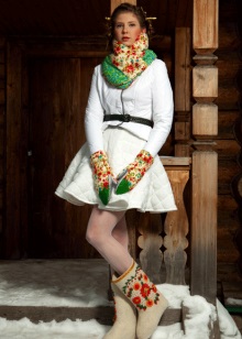 Valenki successfully complement some more accessory in the Russian folk style, for example, a down scarf in the role of a scarf.