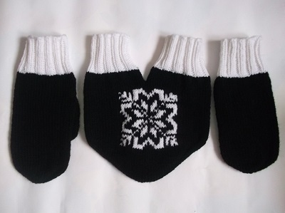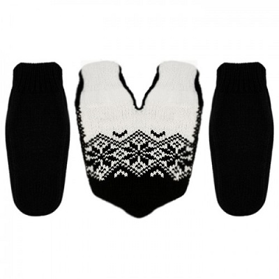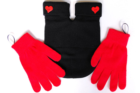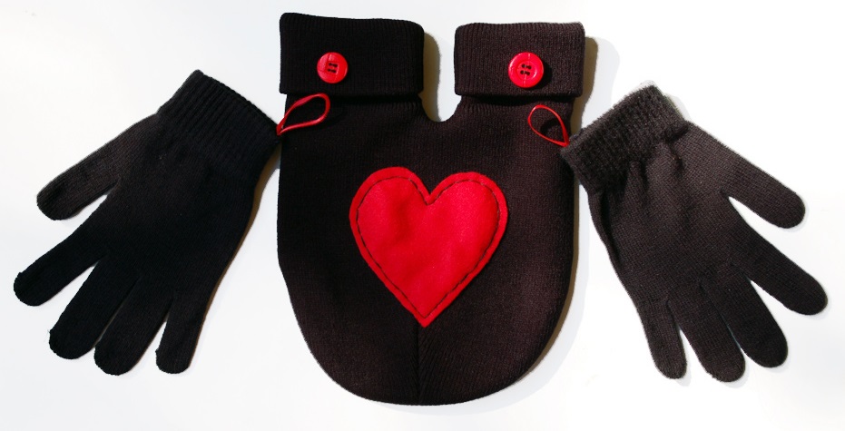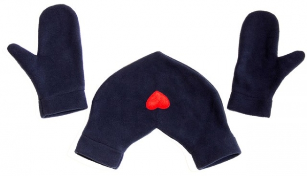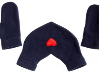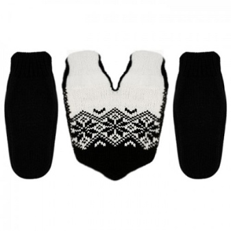 The model of black color with a common mitten and two gloves looks extraordinary. On the pair of mittens, there are two red buttons and a large bright heart, sewn along the contour. Gloves are equipped with loops and, when not needed, are fastened with buttons.