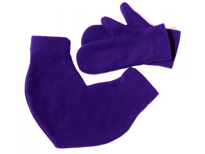 Very beautiful mittens made in purple color. White fleece interior finish is very soft and warms well against frost. On top of the mittens are wide cuffs of a dark blue tone with embroidered snowflakes.