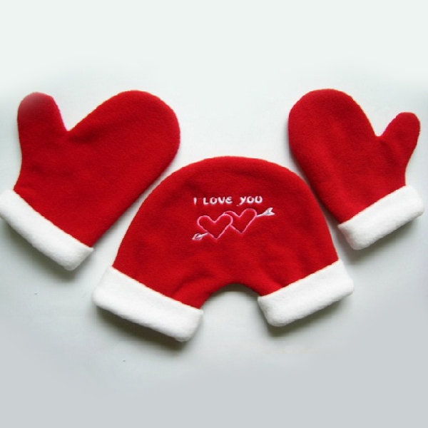 Fleece products are very soft and perfectly complement the casual style, adding brightness to it. Often, they are decorated with embroidery in the form of two hearts pierced with one arrow. Made in red with white fringe, they look like Santa Claus mittens.