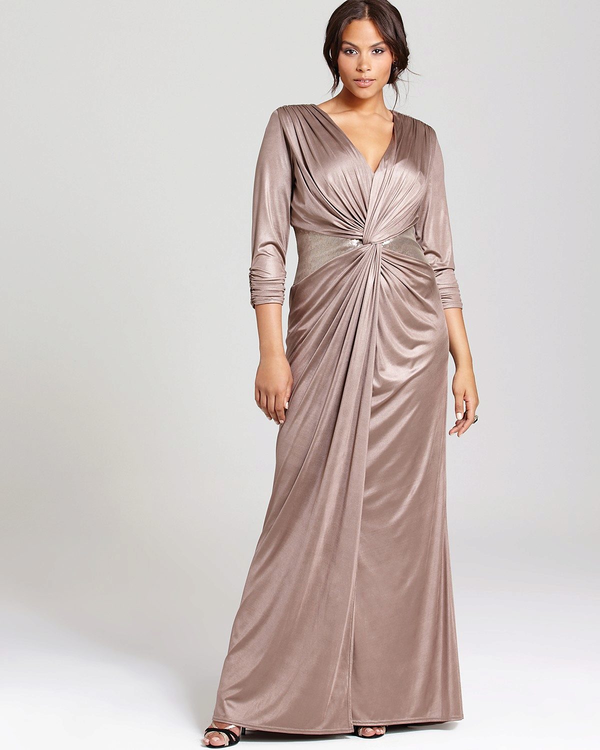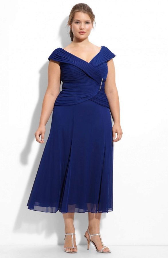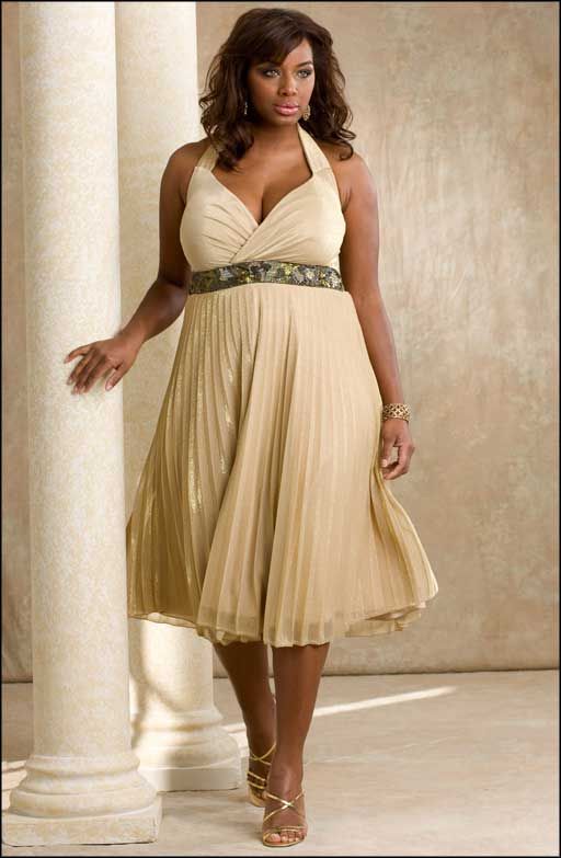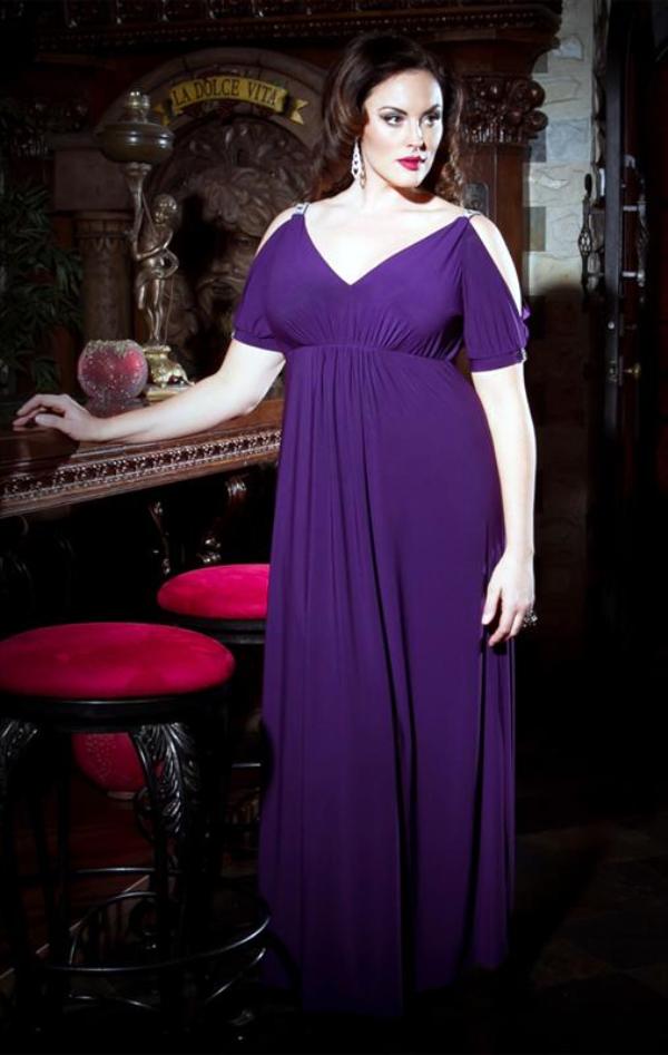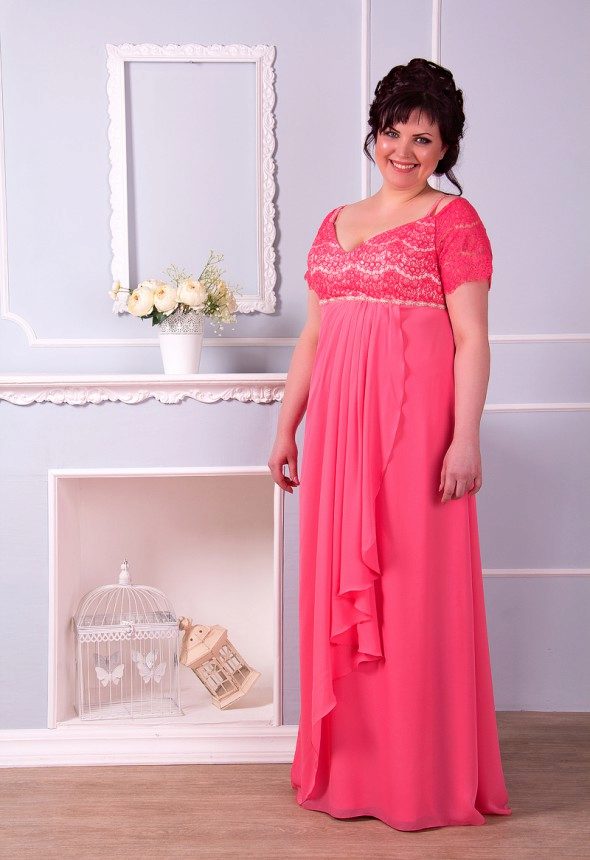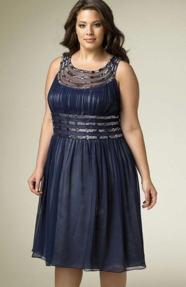Having a big chest and not highlighting it is a crime against yourself. Dresses should definitely contain a deep neckline in the shape of the letter V. Shining elements in the bust area are permissible. On luxurious forms look good multi-layered dresses and tunics.
