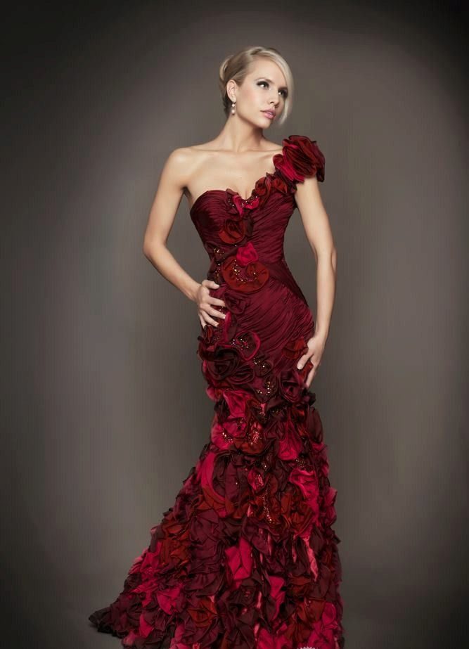 Maroon evening dress is not as flashy as red, but at the same time attracts attention. The dress on the 3m photo seems to be just gorgeous with rose petals.