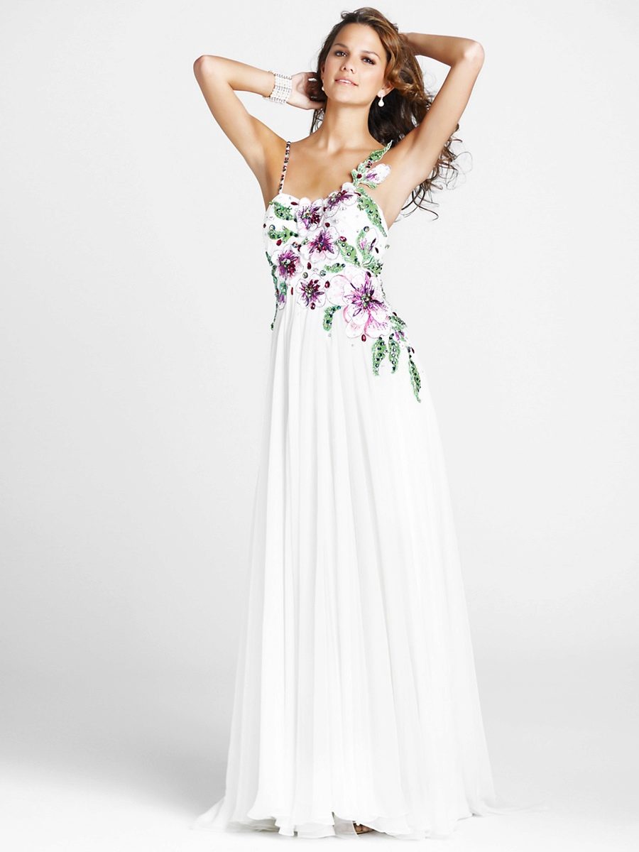 Today, dresses in the floor remain incredibly popular. They are made of translucent fabrics, fitted, with short petticoats, flirty top layers of skirts, with cuts, asymmetrical hangers, and so on.