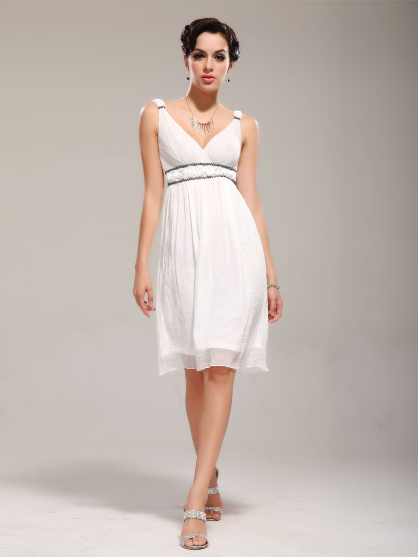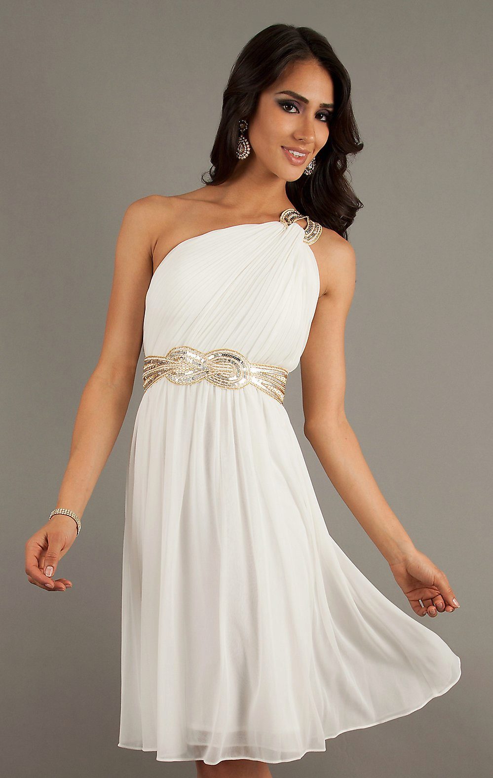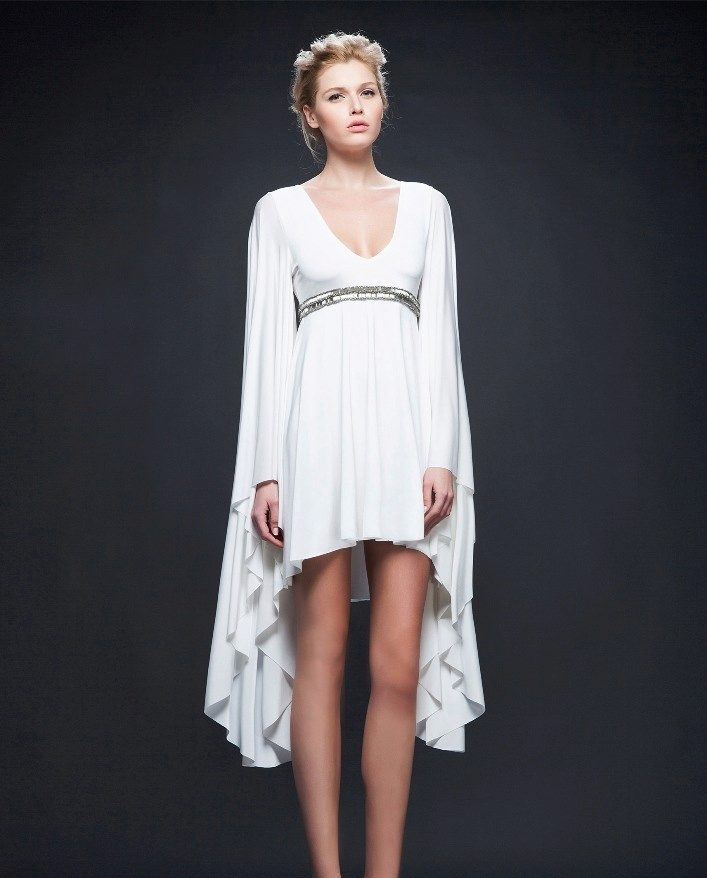 A Greek evening dress looks original, short in front and long in back. This is a kind of modern interpretation of style.