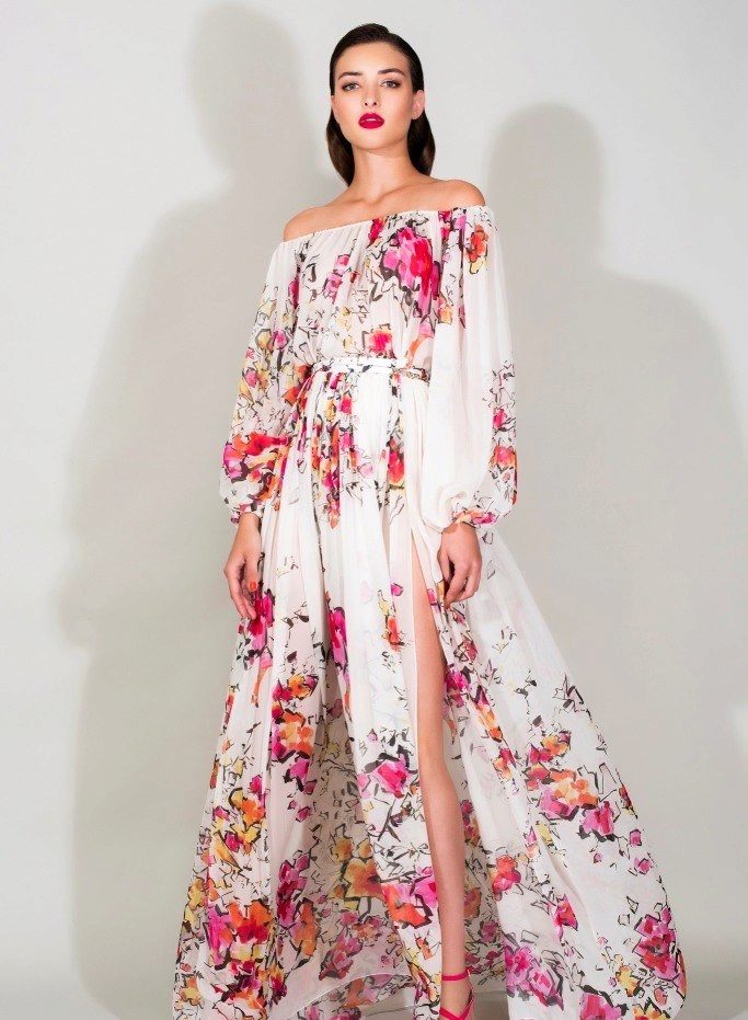Saturated prints on chiffon create an incredibly fun, summer and carefree image, an atmosphere of joy, celebration. It is better to choose wide skirts, long, made in the style of the year or a unique half-sun. Due to this, your movements will be free, and your gait will be like flying. If the dress is short, then complement it with a train. Spice up the image will add a cut.