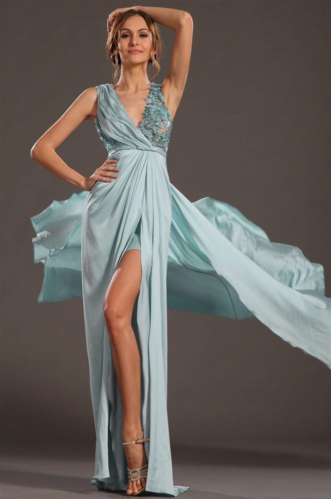 You will find models with long “floor” skirts with a slanting cut, emerald flowers, plastic hip-hugging, falling down soft folds, deep cleavage. Thanks to the latter, you will be able to visually demonstrate your summer tan, and the dress will only complement the color of your skin, present it in the best possible light.