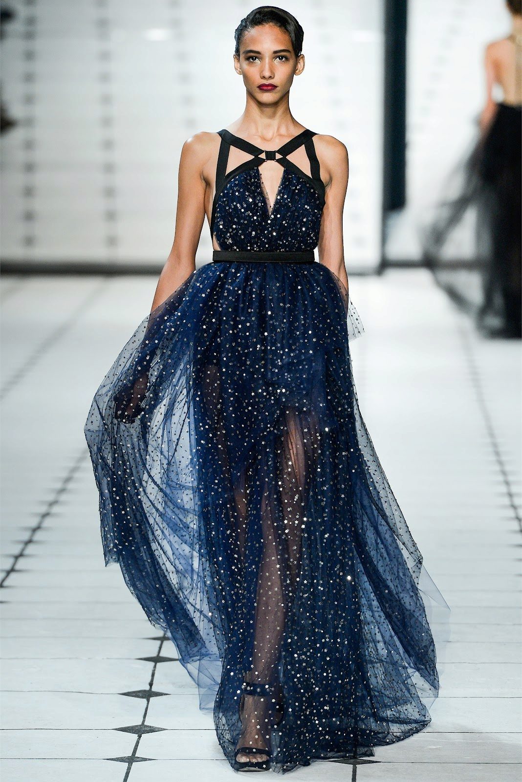 Starting from the line of the knees, the hem begins to diverge in large lush waves, the material for which served as expensive tulle. Obviously, designers have long worked on the image, literally thought out every element, bringing the dress to perfection. And, we admit honestly, they succeeded. How else to explain such a unique, sublime and mysterious silhouette that appears before us?