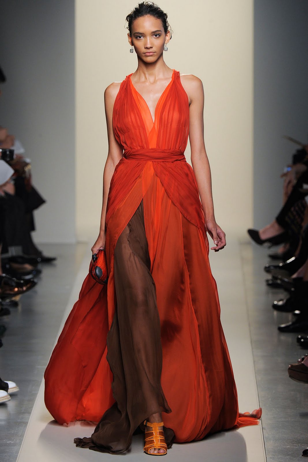 In the adjoining silhouette, it is better to abandon the tight bodice, since the plasticity characteristic of chiffon is important here. You can focus on it using draperies.