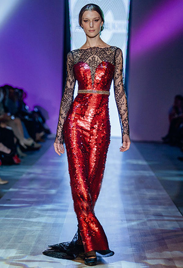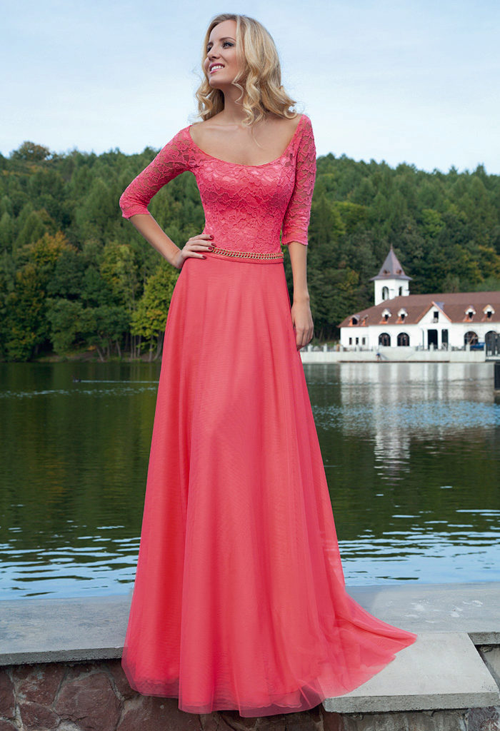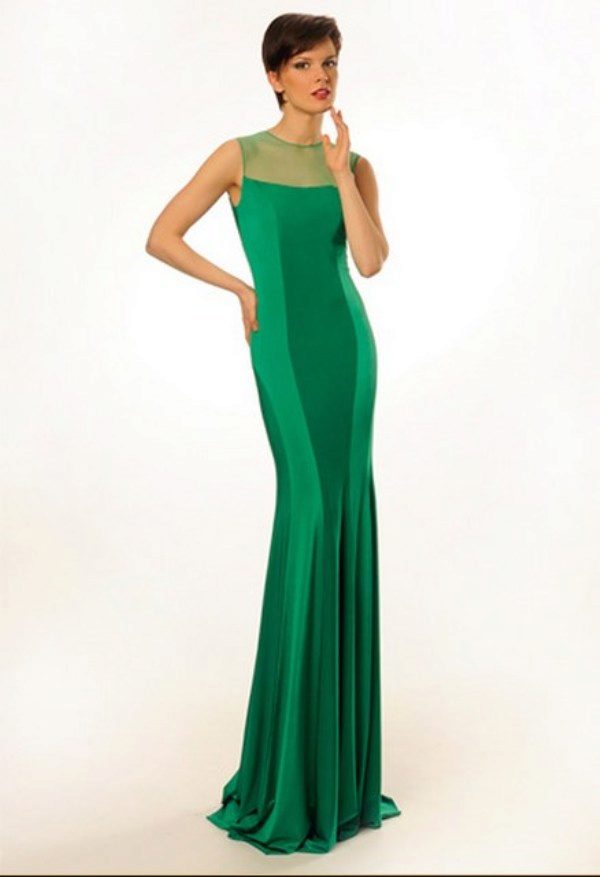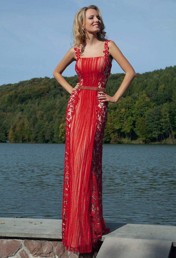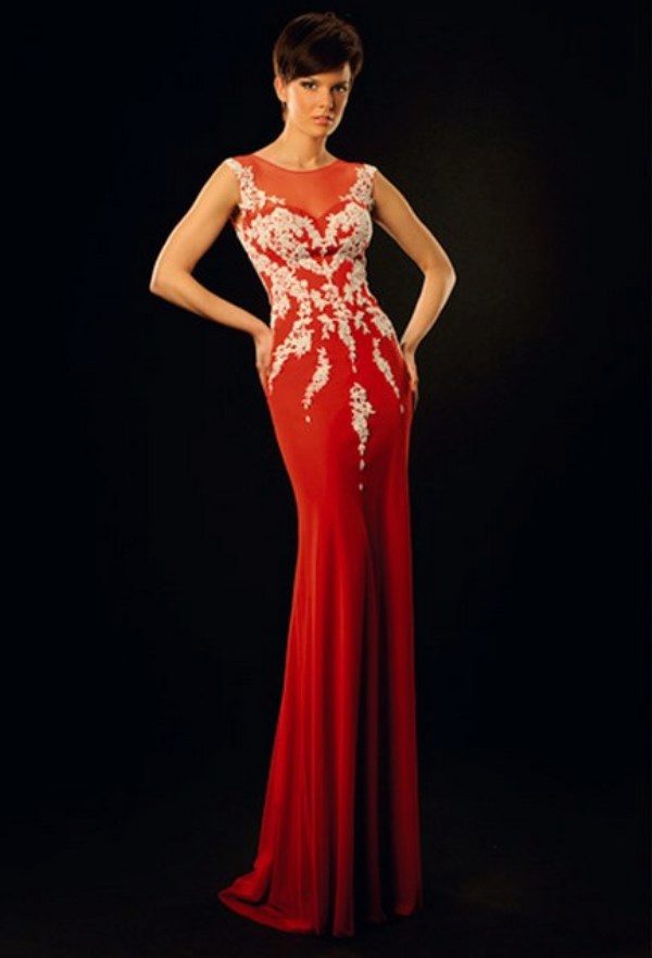Any model will harmoniously look on your figure due to the unique system of undercuts, developed by the designer. Almost all models go without sleeves, but the red dress with a lace top is striking. Although here the sleeve is modeled in such a way that the shoulders and neckline are still open.