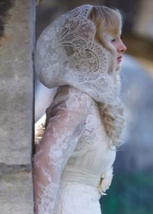 - Hood - a convenient element of the image, resembling an ordinary hood, with an extension to the shoulders, fastens with buttons. A variety of such products can be considered a spacious cape - "cloak". Its length can reach the floor. A dress with a train looks especially harmoniously with this drop-down accessory. Favorite modest brides who worship religious ordinances.