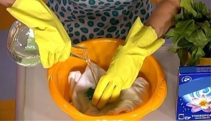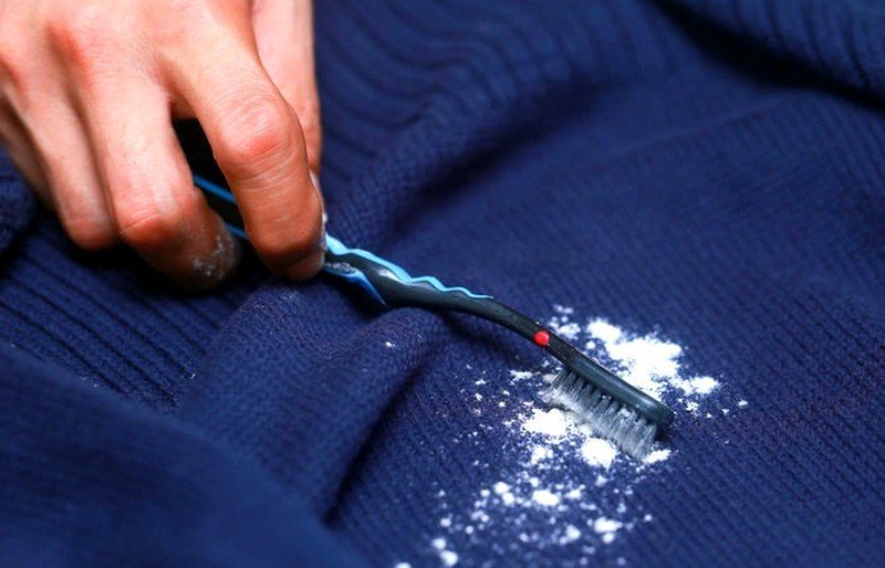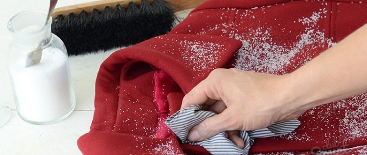 Any fresh stains from the colored and light fabric can be removed with salt or dry tea. The crystals and leaves quickly absorb moisture and do not allow the stain to remain in the fibers.