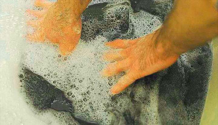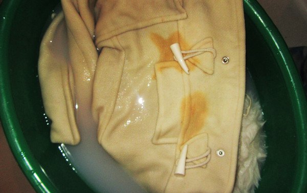 Carefully and gently dip the coat into the solution with powder or vanish. Do not make sudden movements during washing, so as not to deform the fabric, hard brushes and strong friction is also prohibited. After this, thoroughly rinse the coat without using strong water pressure.