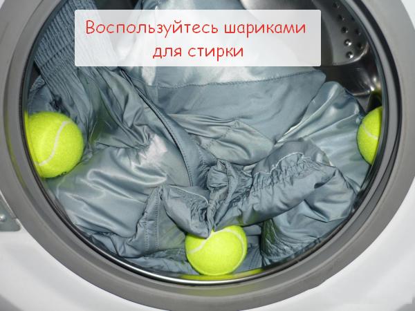 - For a more uniform washing in the drum, special balls for washing are laid, they gently smooth and beat the product, preventing the synthetic winterizer from losing up. If you do not have such devices, some hostesses recommend adding 3–4 tennis balls to the drum. Next, run the wash.