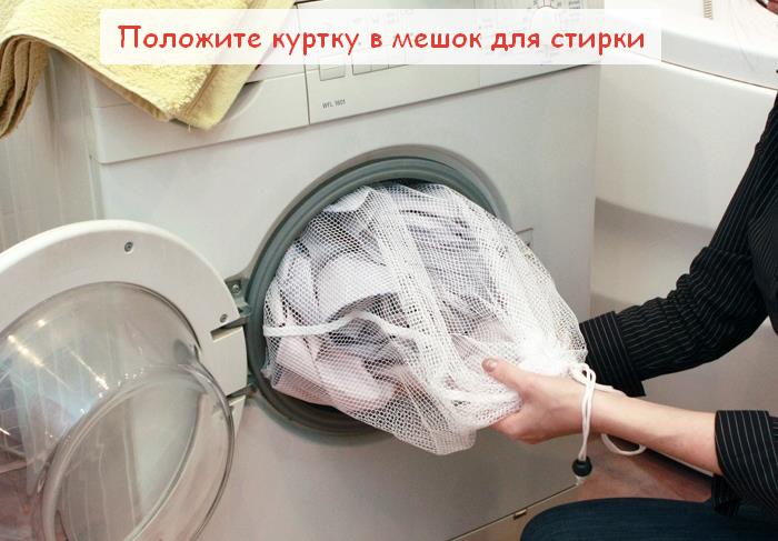 - Turn the jacket inside out and put it in the car. There must be one product there, it is better not to report anything, even if the drum seems empty to you. Putting the jacket should not lump, and neatly distributing. If you are afraid that the jacket may be damaged, then load it in a special bag for washing.