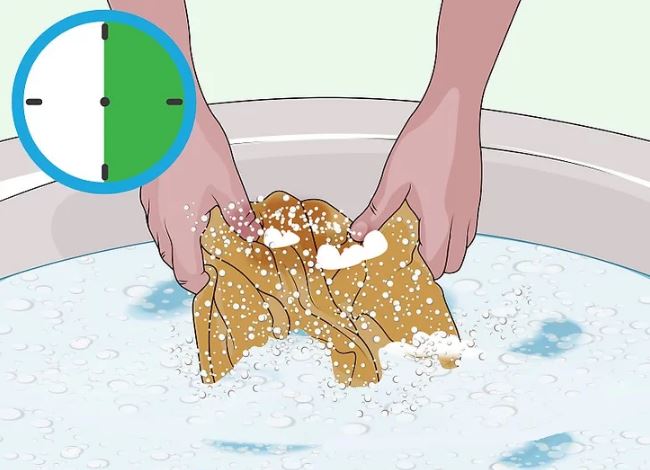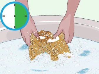 - Soak your product in the prepared solution. Soaking time 15-20 minutes. If your coat has areas of severe contamination, such as stains or scuffs on the sleeves and cuffs, they should be carefully stuck before soaking. To do this, apply foam from a cleaning agent or shampoo to the place of contamination and gently rub it into the fabric with a dry sponge or soft brush, without strong pressure. After zastiryvaniya you can soak the whole product completely.