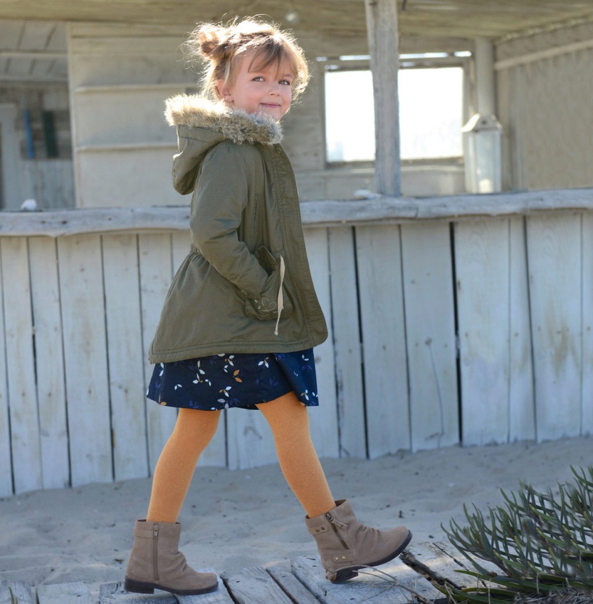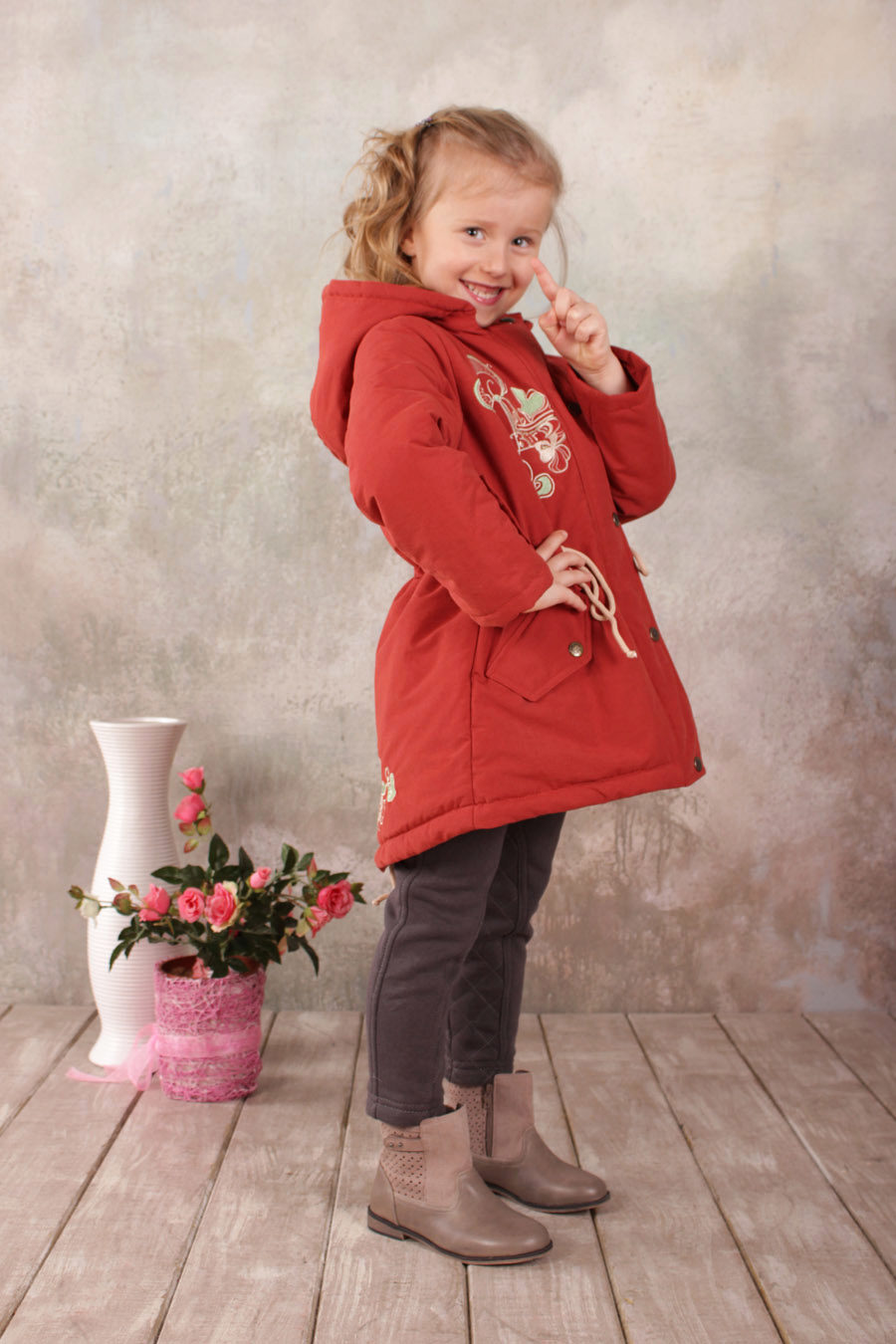 Thanks to the elongated silhouette, adjustable elastic bands and a warm hood, the park will be able to protect your daughter from any weather.