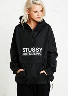 Bulk windbreaker with a lowered armhole is suitable for girls who are not accustomed to something to restrict their movement. The jacket of a free style will give the chance to move easily and freely. Please note that it warms worse than fitted models, so you should wear thermal underwear at the bottom.