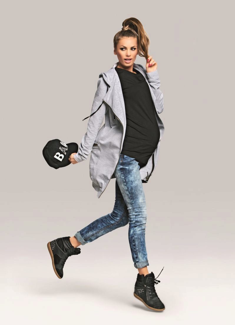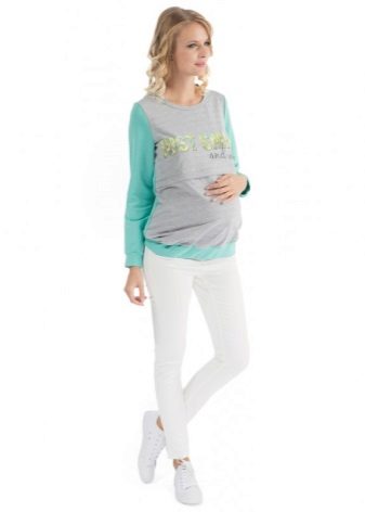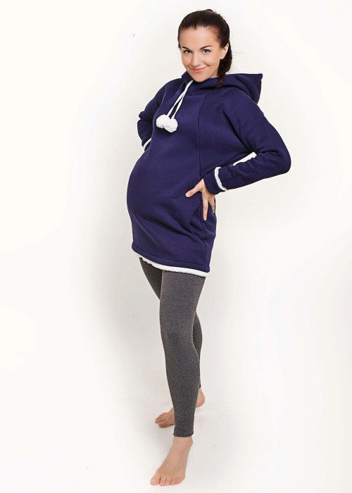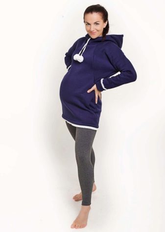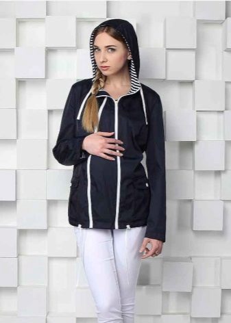 Hoodies can also be considered one of the varieties of windbreakers. Those models that have a hood are quite suitable for windy weather. However, hoodies do not save from rain, as they are usually sewn from knitwear. On cool days, the future mom will be very comfortable in a warm sweatshirt on a fleece or footer.