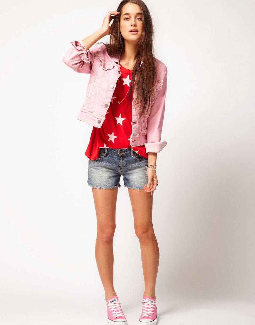 - A denim windbreaker and jeans or denim shorts are a perfectly acceptable combination, which is relevant again this season. But when choosing such a set, pay attention to the fact that the upper and lower parts of the attire differed by several shades.