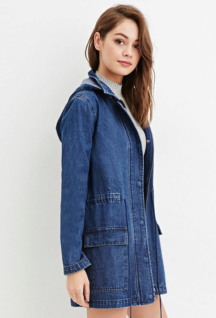 Jackets-parks that are popular among young people are made from denim. Denim Parka looks fresh and original. The large hood, elongated silhouette and a large number of zippers make this jacket your reliable protection from the vagaries of nature.