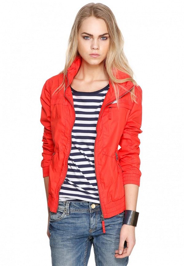 A bright red windbreaker without a hood will perfectly complement a black evening dress or a strict office suit in a black and white or dark blue gamut.