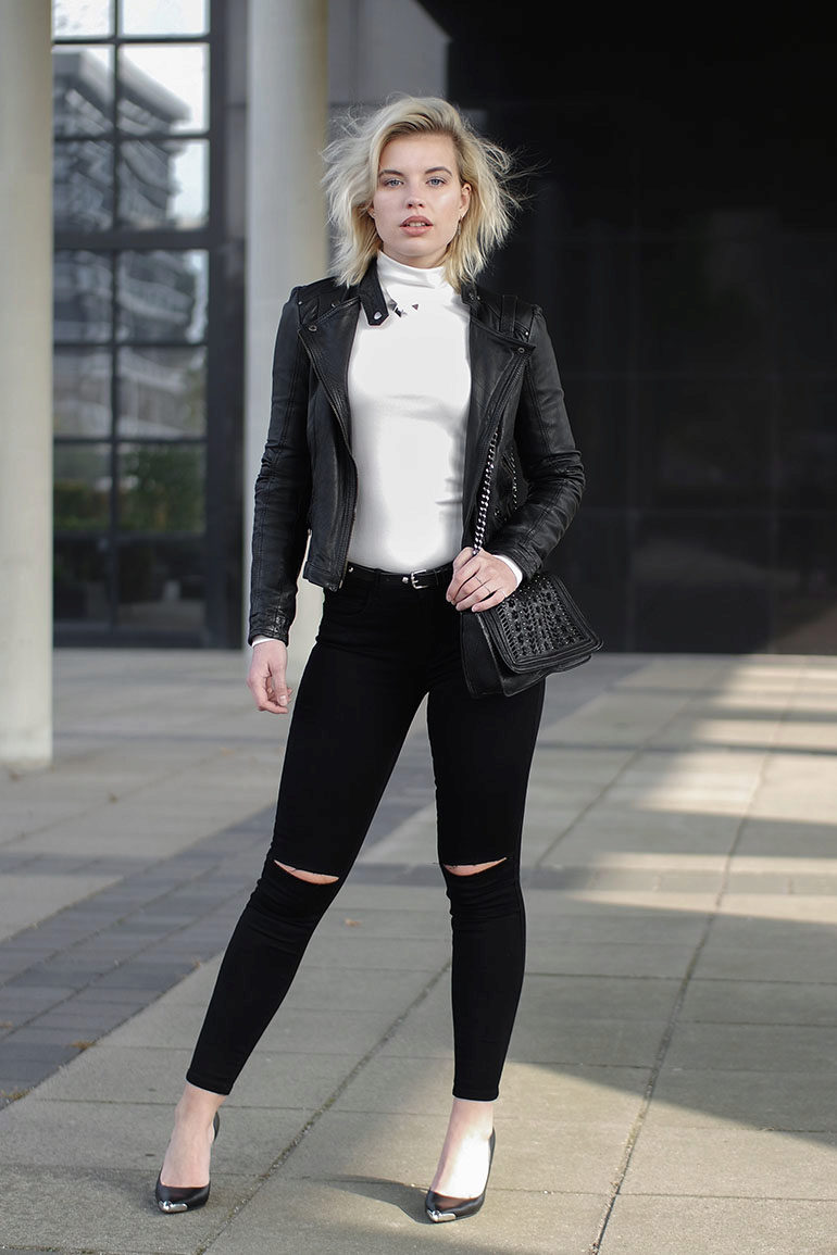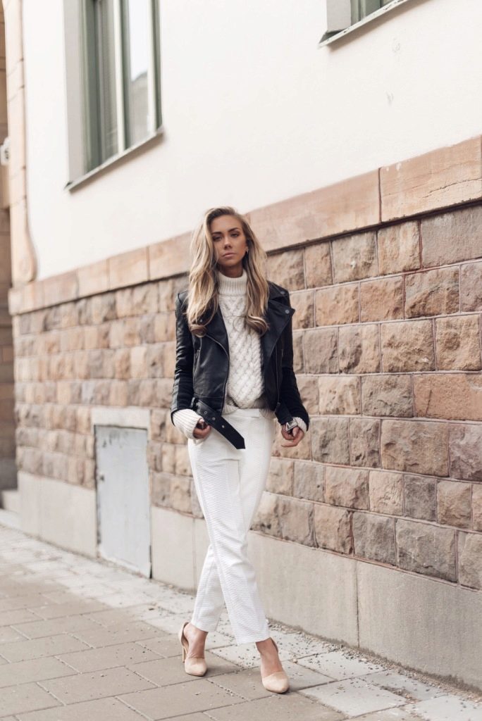 The combination of a white turtleneck with pants or a skirt made of leather · looks very feminine and sexy.