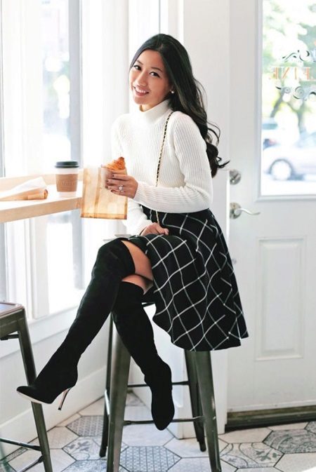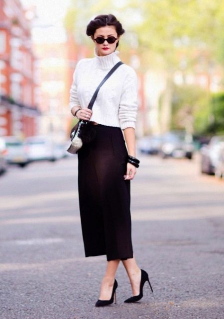 The choice of skirts is diverse. A set with a pencil skirt will accentuate your curves. Mini-skirt is perfect for a date or meeting with friends. A flared knee-length skirt in combination with a white turtleneck will add romance and femininity.