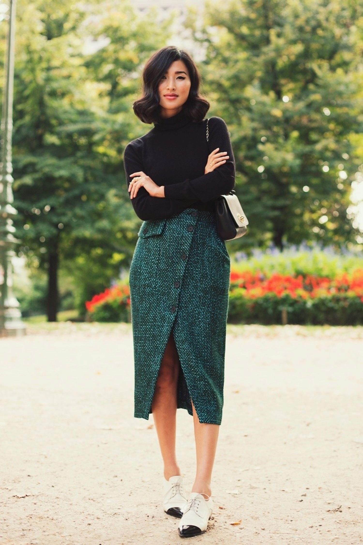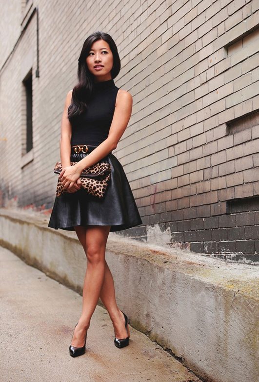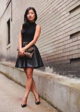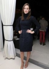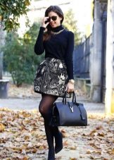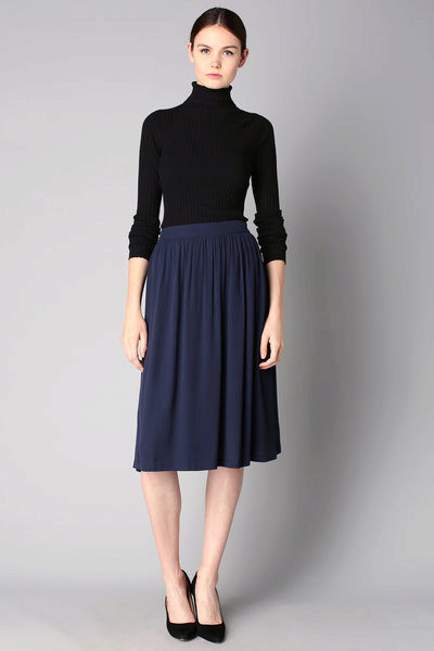 Dress in a black turtleneck and a navy flared skirt below the knee for a casual look. Suitable for going to the theater and to work, as it looks very presentable. Mandatory shoes with heels.