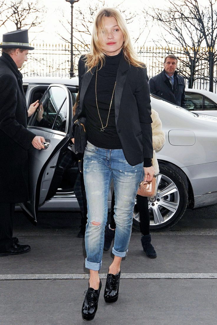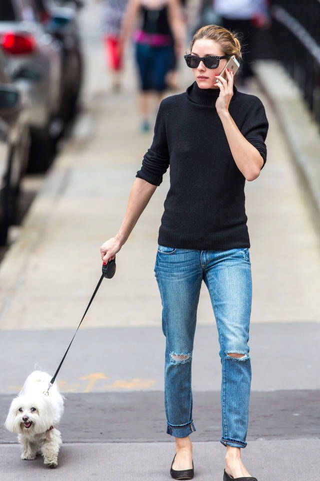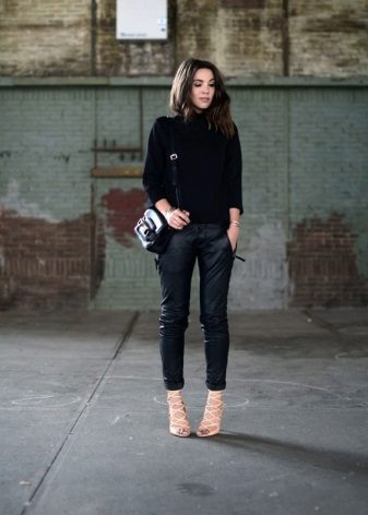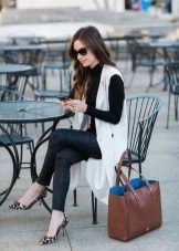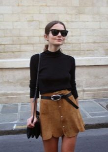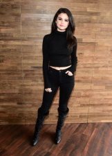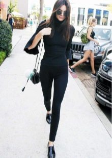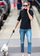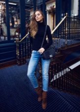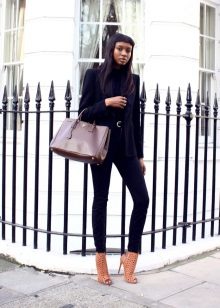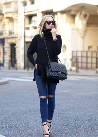 Black turtlenecks are great for jeans of all kinds, including shabby. The best shade is dark blue. This is a great option for traveling, walking and shopping. Its main difference is practicality. Turtlenecks are combined with mini or midi skirts (knee length). It can be cotton, tweed or leather.
