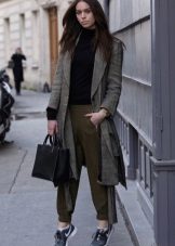 For a casual setting, choose casual pants - beggie or chinos. They can be bright colors, in a cage or with a different print. Add a black belt and put on a leather jacket, leather jacket, coat or trench coat.