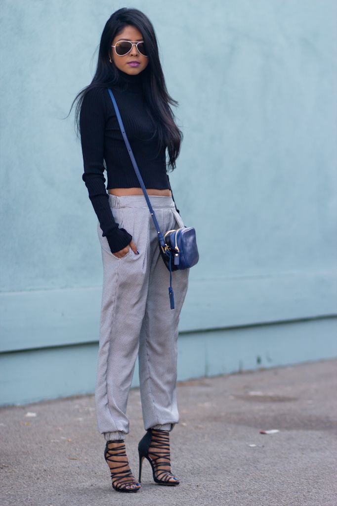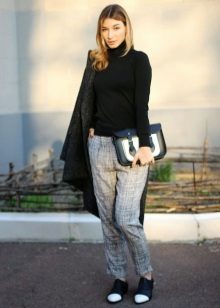 Turtleneck + trousers with a goose foot pattern. An interesting necklace on the neck emphasizes charm and femininity in the image.