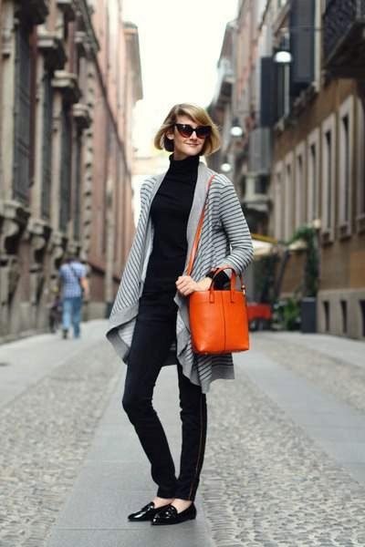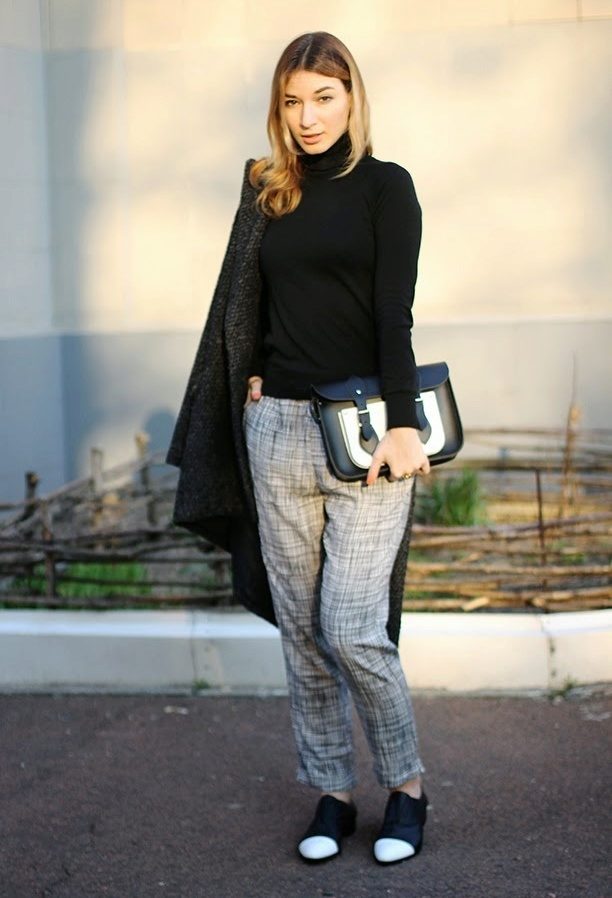 For work the classical choice is a simple black turtleneck. You can wear it with classic-fit trousers, pencil skirt or flared skirt. Bottom is also better to choose dark or neutral shades - blue, gray, black.