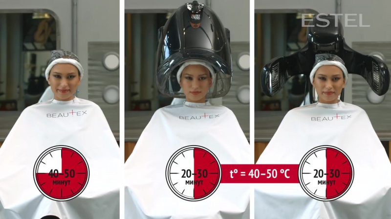The treated hair is wrapped in film and left to the Clinic for 40–50 minutes. The time can be reduced to 20–30 minutes by using a sushiuar or klimazon at a temperature of 40–50 ° C. After the compositional time, the curls are dried with a hair dryer to dryness.