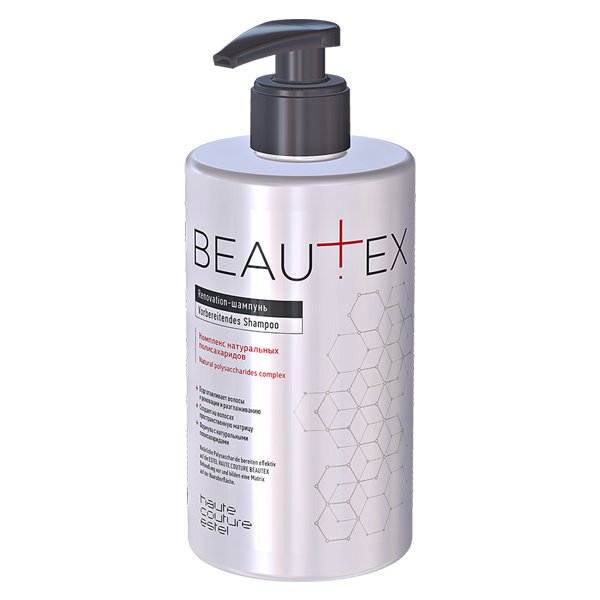 Beautex comes with a 435 ml non-sulphate Renovation shampoo. In addition to the absence of Sodium Lauryl Sulfate, which often causes dry hair and scalp, Renovation differs from regular shampoos in its content of polysaccharides. They are needed to gently clean the curls and open the scales before the serum is applied. Thus, it can act from within and fulfill the promises given by the manufacturer.