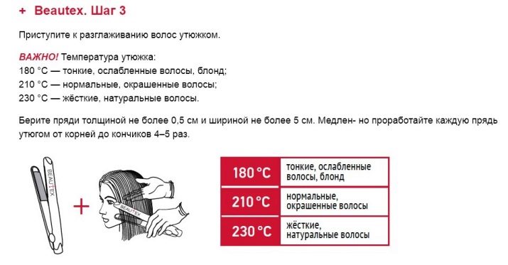 The next stage of the procedure is serum soldering into the hair. To do this, all the curls sequentially processed irons. It is important to do everything carefully and choose the right temperature depending on the type and condition of the hair: