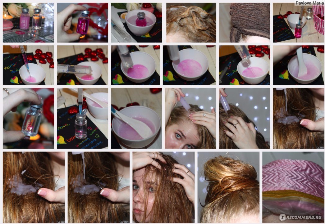 - At home, the composition is applied to the hair and warms up. Some manufacturers have indicated that the composition is applied 1-2 cm away from the roots, others write that the composition is distributed from root to tip. After that, the hair is combed through. They wear a special cap and heat the composition applied to the hair for 10-15 minutes, while the head should be in a cap. When exposed to temperature, the active substances penetrate the hair, envelop them and seal them. Next, the tool is washed with water, shampoo is not used.