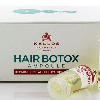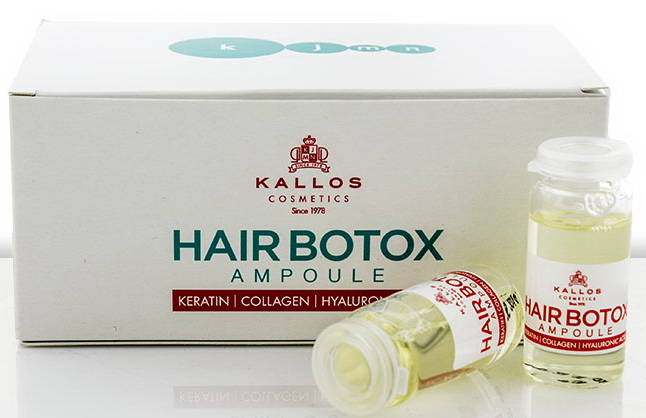- Kallos Hair Botox. This is perhaps one of the best tools designed for the salon, as well as for home care. The structure of the mixture is filled with a mineral-vitamin complex, amino acids and other substances necessary for hair. The kit consists of 6 vials of serum, as well as a syringe and gloves that facilitate the application of the composition to the hair.