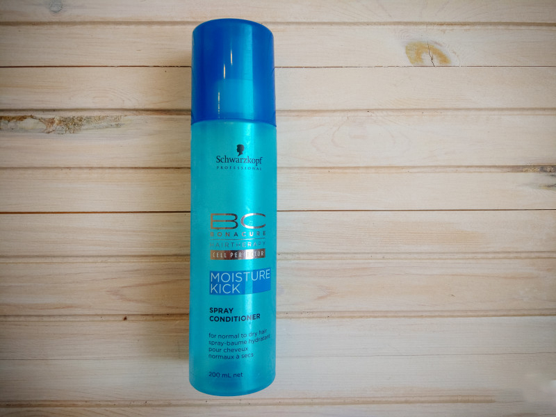 - Schwarzkopf Bona Cure Moisture Kick - spray conditioner for weakened strands with a formula of deep moisture, an effective remedy with hyaluronic acid, silicone, panthenol and vegetable oil.