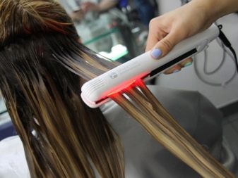 Once on the hair will be a means for molecular recovery, strands need to “stretch” with the help of an iron. And each strand, in order for all the components to penetrate the hair, is processed 4-5 times. This "fixing" contributes to the fact that the keratin from the tool begins to fill the inner space of the hair shaft, contributing to a change in its physical properties.