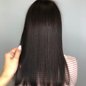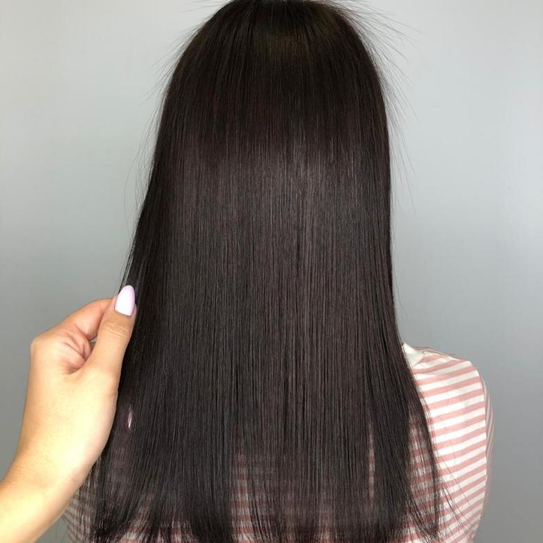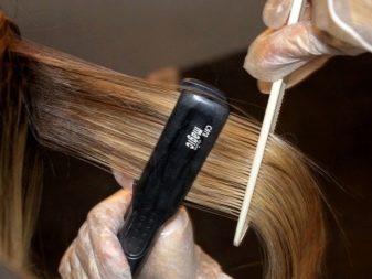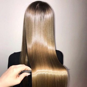 - The hair is divided into thin strands and each is aligned with the iron. From the effects of high temperature, the components of the composition are sealed inside the hair, which ensures a lasting effect. This stage is the longest and most exhausting. For thick hair, a higher temperature (220 degrees) is chosen, it will be sufficient to heat the iron to 170-190 degrees thin.