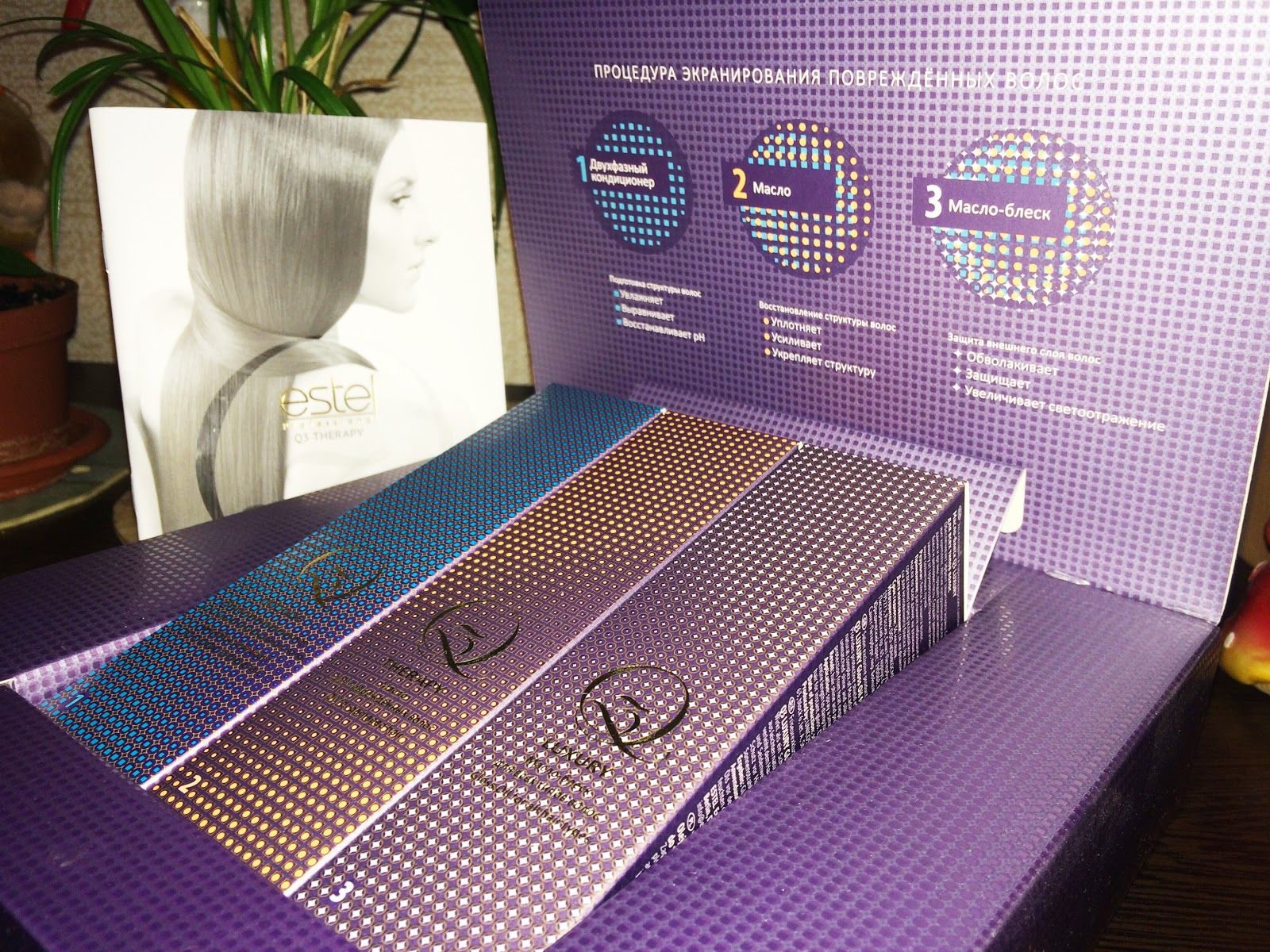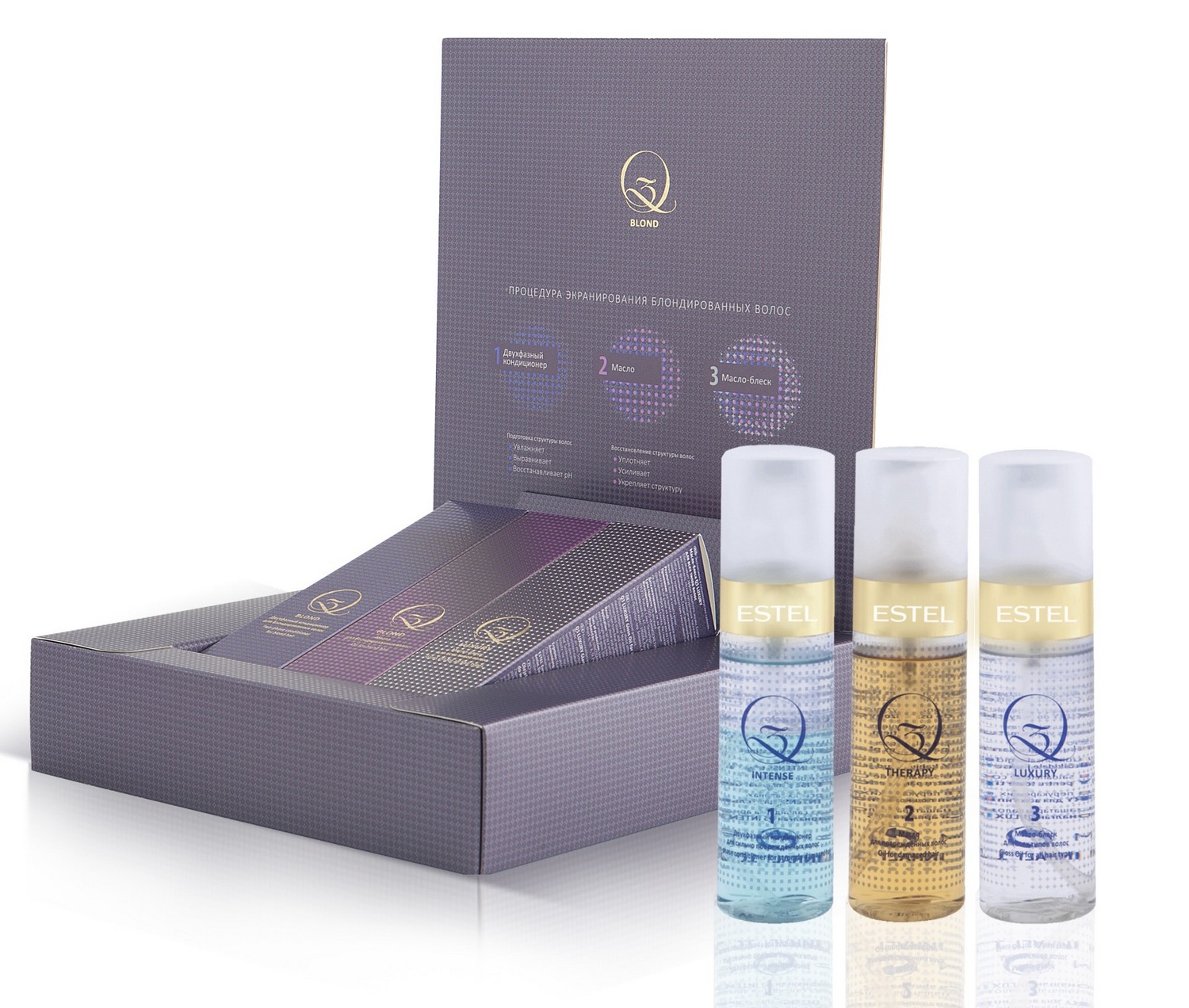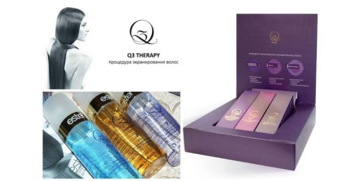 - Q3 Therapy Kit (for injured strands). It will allow to level, strengthen, moisten and restore the destroyed hairs, will give them protection from thermal damage and UV radiation.