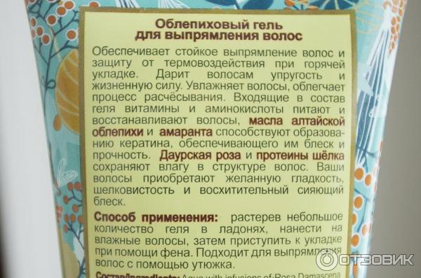 Sea buckthorn gel for straightening curls from Natura Siberica. This product has a natural composition, it fixes the styling well, without weighing down the strands, and additionally heals them and restores the natural glow.