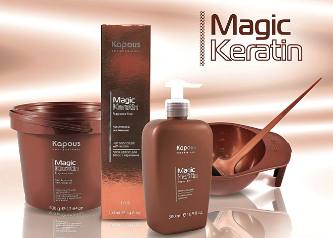 For those who constantly dye their hair, there is paint with keratin. It is distinguished by a more gentle effect on the curls and at the same time the effect of healing. This effect is achieved due to the ammonia-free formula and keratin content. Since the paint in order to penetrate deep into the hair, slightly opens the scales of hairs, along with it keratin also penetrates there, which during the aging of the composition on the curls has a regenerating effect. An example of such a paint is “Magic Keratin” by Kapous.
