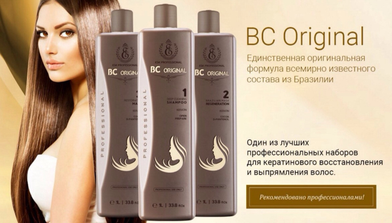 Examples of such complexes for keratinizing hair are: “Keratine Royal Treatment” from Ollin Professional, “Keratin Treatment” from Greymy, “BC Original” from SK Professional, “Gloss” from Bombshell and others.