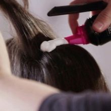 - The head is slightly tipped back and foam is applied to the base of the hair.