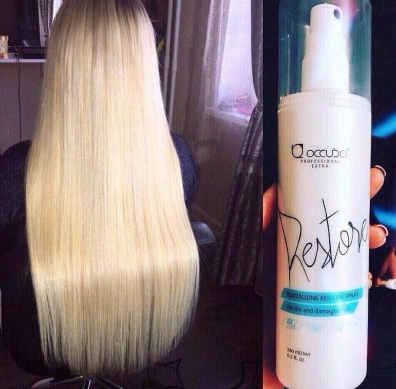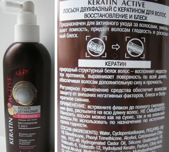Liquid keratin is contained in Gliss Kur sprays, which have been used by many women for more than a year. The tool is great for all types of hair, it helps to restore their shine, elasticity and silkiness. Perfectly restores damaged strands after dyeing, perm and other procedures. Spray from this brand is easy to apply and spread over the entire length of the curls. A noticeable result occurs after the second or third application.